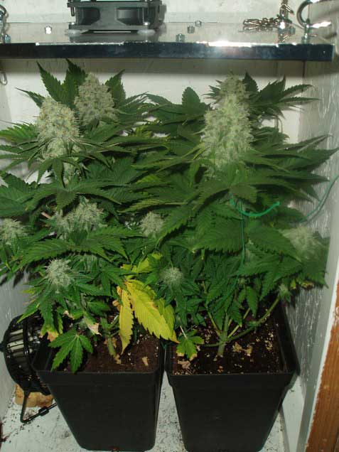 And here is a daylight picture of the plants under the red/white panel, hardly any coloured hairs yet. They sure look fine, but next time they could use some extra vegging.